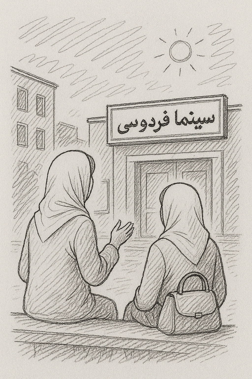 I once experienced this kind of just-being-somewhere at the cinema. One time, I finished work early—not because I was fast, but because something hadn’t happened—and I was left wondering how and where to spend the rest of my time. I called the first friend in my recent calls list. Golnaz came huffing and puffing from Amirabad, grumbling that she was just about to have lunch and had brought it with her but forgotten the spoons. The sun blazed hotter. The grilled fish in Golnaz’s bag had developed a very specific smell, and the two of us wandered the city in the early summer heat, unsure how to kill time.